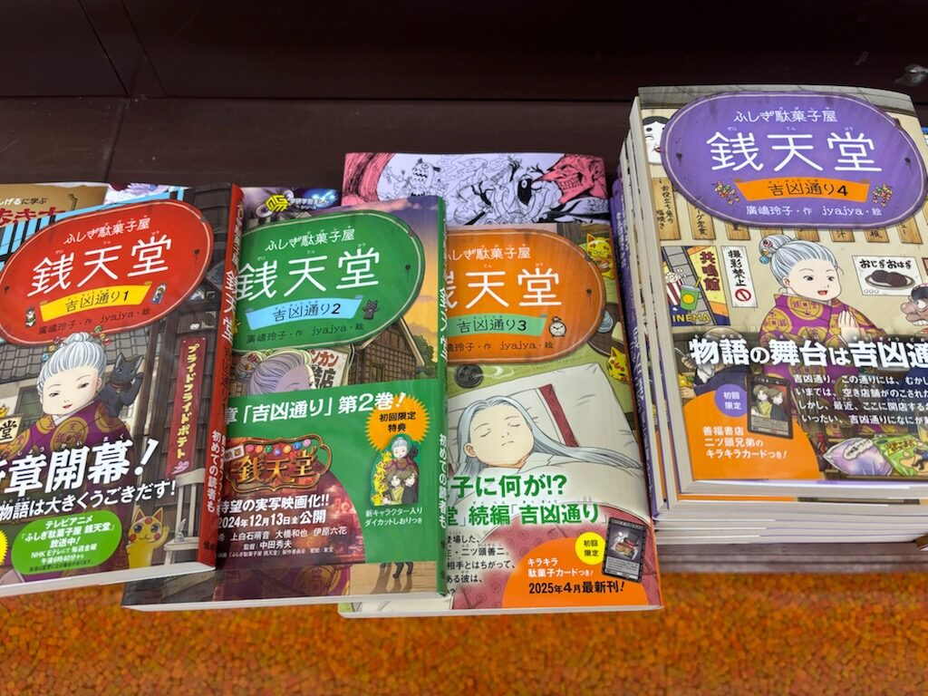 廣嶋玲子著の人気シリーズ「ふしぎ駄菓子屋銭天堂」の番外編「吉凶通り」の第4巻が入荷いたしました。1巻より揃えておりますのでぜひ。